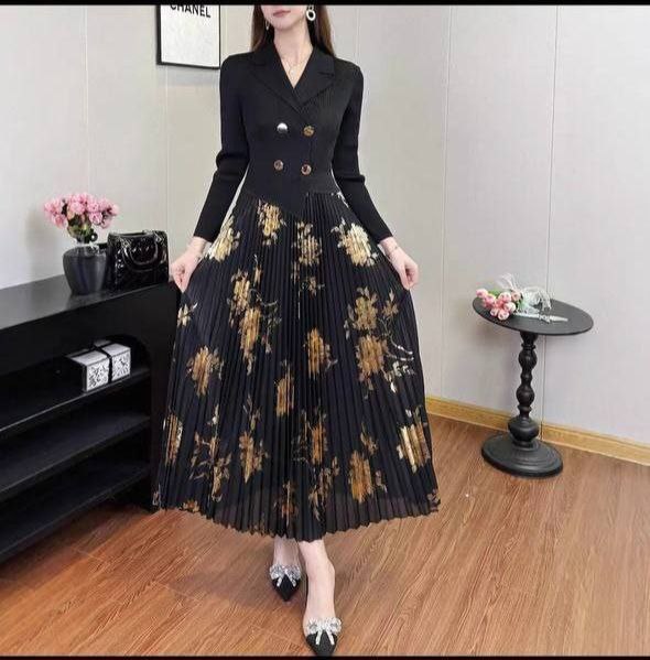 Ribbed Knit Pleated black dress with Asymmetrical Neckline