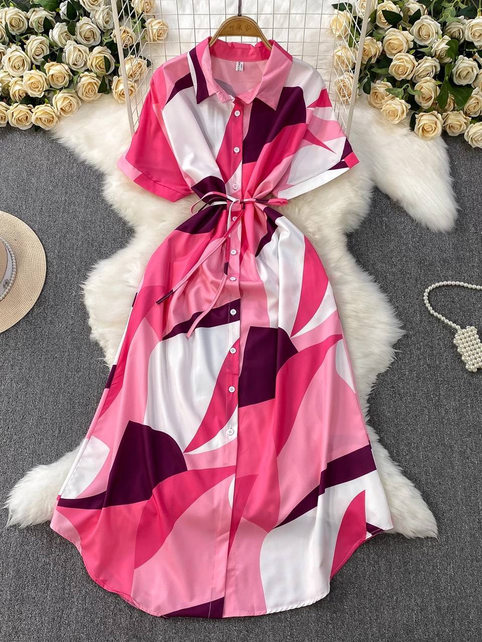 Short-sleeve belted midi shirt dress